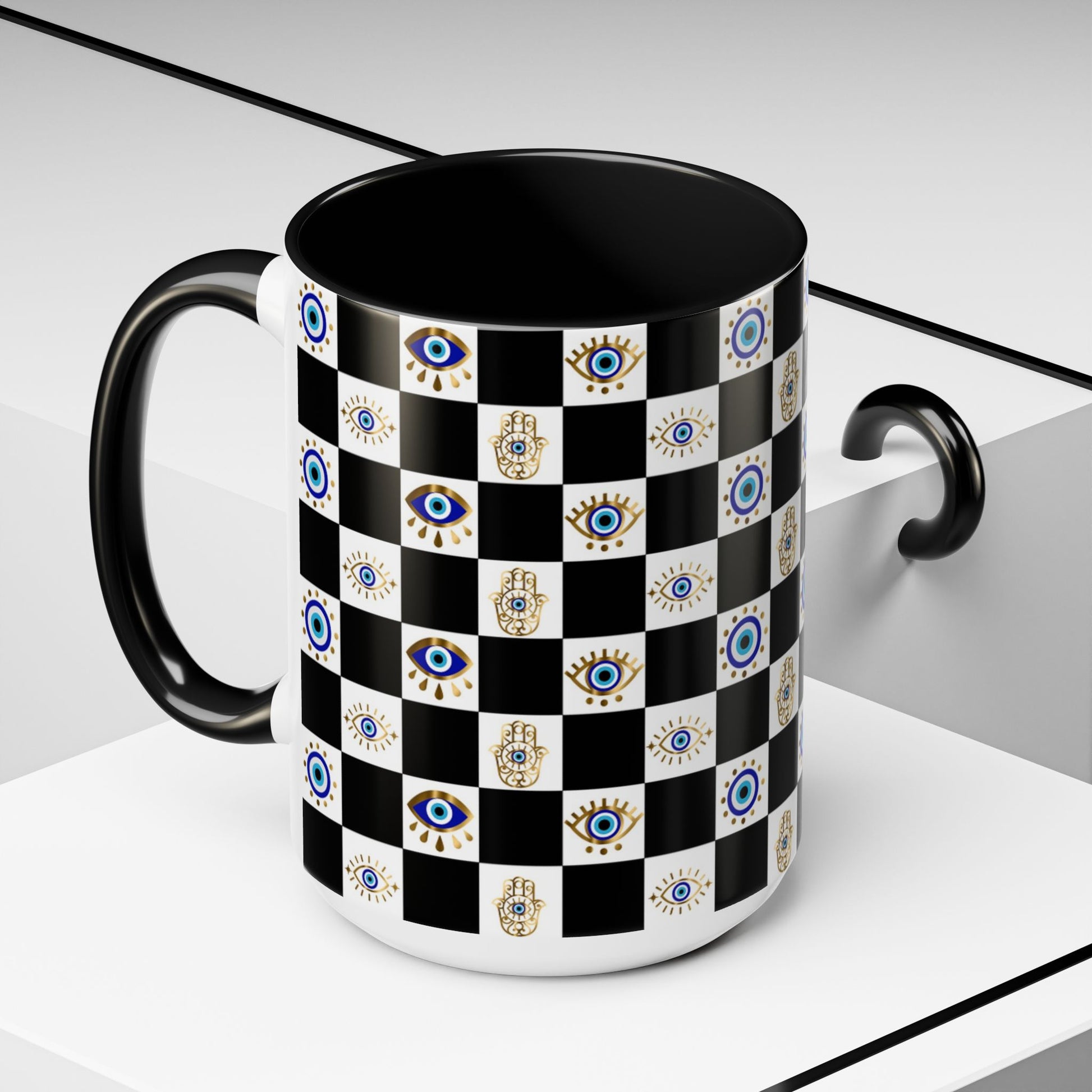 Eye-catching Nazar Evil Eye Checkered Accent Coffee Mug, available in two colors - black and navy blue. Perfect for adding a touch of protection and style to your morning routine. Ideal for those who appreciate unique designs and symbolism. Relevant for birthdays, housewarmings, or any occasion where a thoughtful gift is needed.