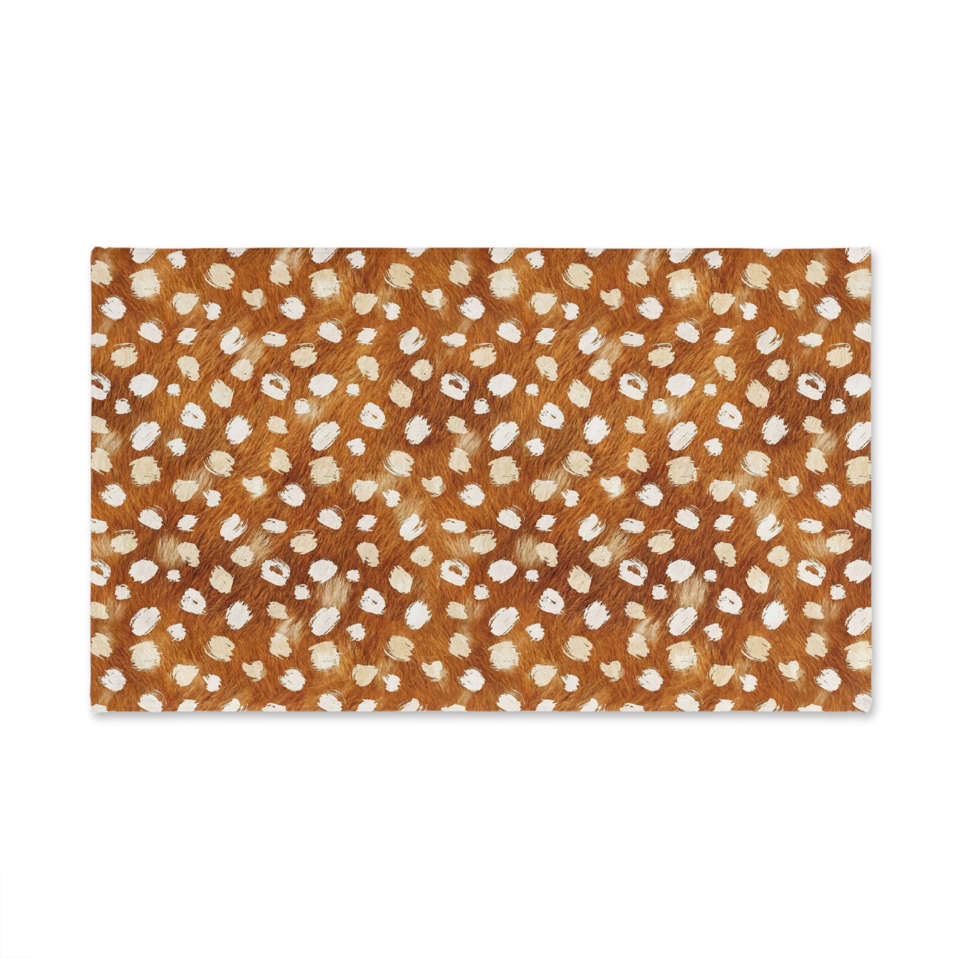 Soft, suede-like hand towel with a warm fawn and white spotted pattern that brings a cozy, woodland touch to your sink or powder room. The lightweight blend feels gentle on hands while drying quickly, and the single-sided print keeps the design vivid and natural. Lay it by the kitchen sink to wipe away morning dishes, hang it in a guest bath to add quiet charm, or tuck it into a cabin-themed collection for a layered, lived-in look. The mottled, organic spots evoke dusk-lit forest floors and quiet walks through bracken — familiar, comforting, and quietly stylish.